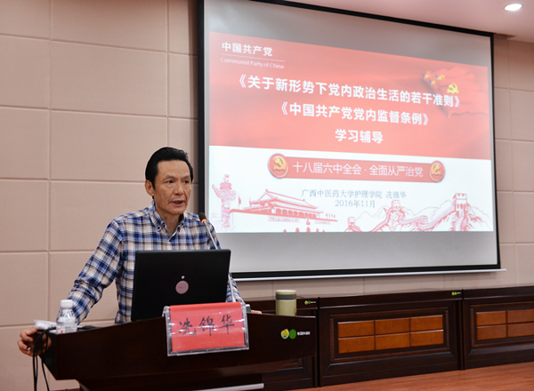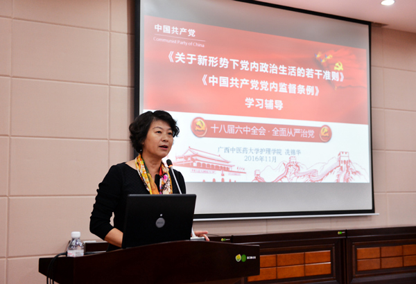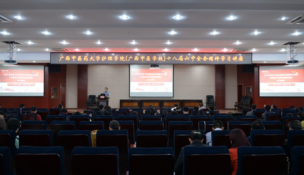 2016年11月23日下午,护理学院(中医学校)举行十八届六中全会精神学习讲座,讲座由党委书记冼锦华主讲,院(校)长吴彬、副书记罗艺徽、副院(校)长林原、黄勇、马秋平及学院(校)全体教职工参加讲座,会议由院(校)长吴彬主持。