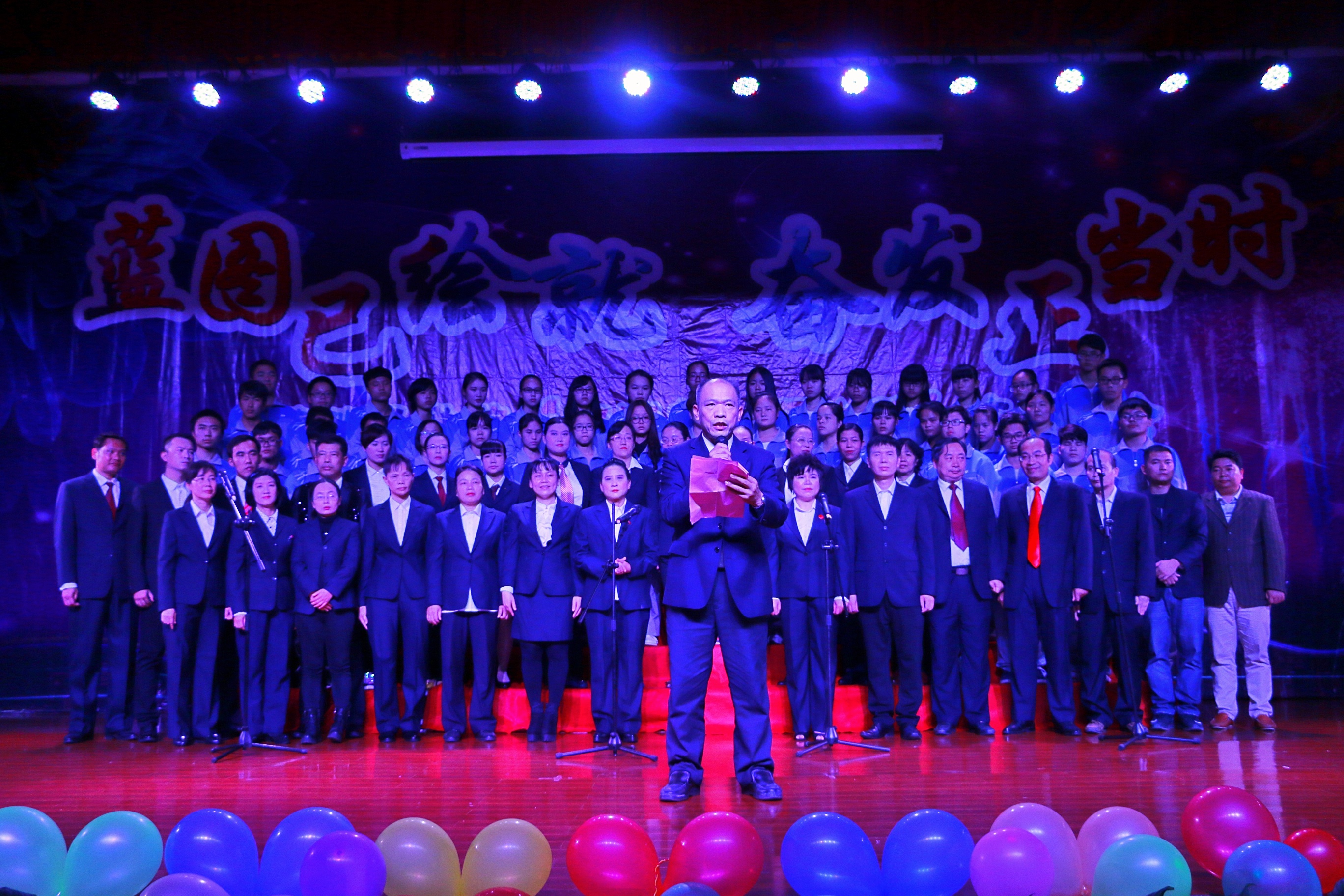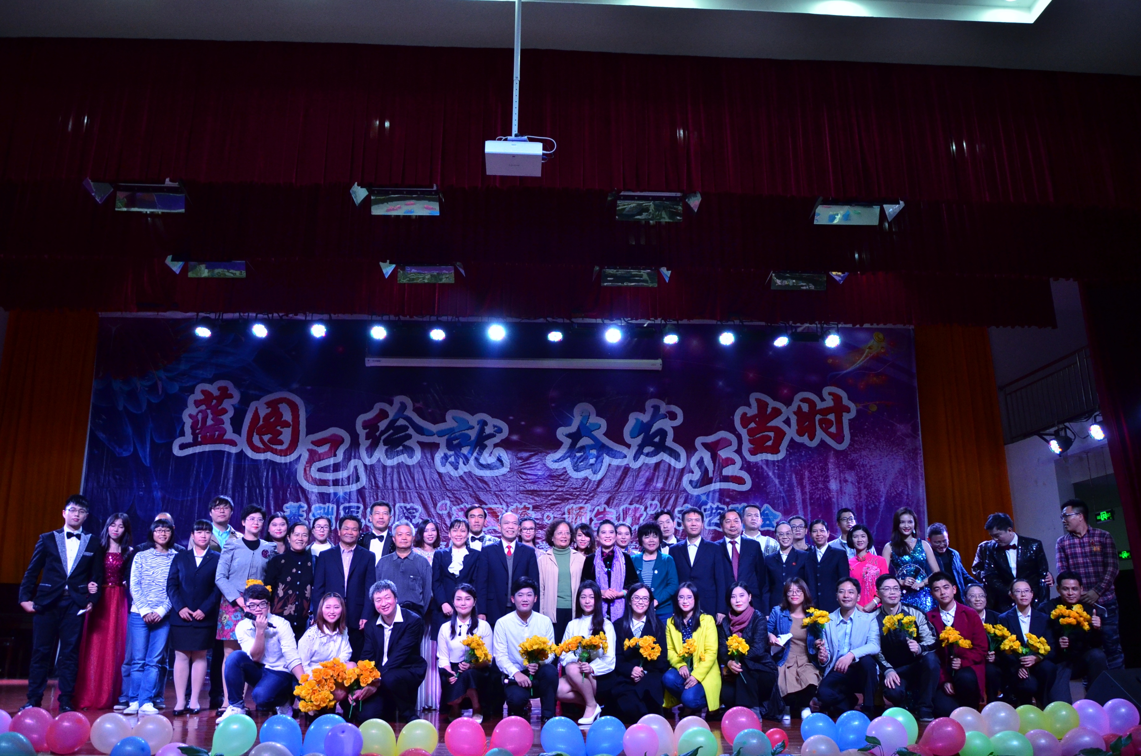 晚会当中穿插有抢答环节:校园文化知多少?主持人以遍布校园的石头上镌刻的文字如“为天地立心……”“格物致知”对观众提问,该文字的寓意及石头所在具体方位,师生积极参与、热情高涨。龚名师书记、林江院长、陈晓林老师等配乐诗朗诵《我的南方和北方》将我们带到了祖国的“大漠孤烟,长河落日。万古稻田,千里水乡”。琴箫合奏、书法表演《卧龙吟》古典俊雅、清新流畅,悠扬婉转的琴箫伴以灵动轻盈、潇洒飘逸的中国书法,字曲相和,相得益彰。生化教研室全体教师用他们略带沧桑感的嗓音合唱《365里路》,一群异乡游子风餐露宿追求梦想的形象跃然舞台,赢得现场掌声雷动。乐宁、黄荣师老师乐队弹唱《命运是我家》、《真的爱你》带给观众无尽的启迪、力量和感动,观众欢呼声如大浪滔天。