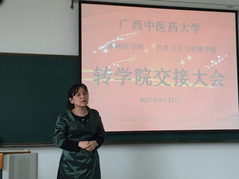 公共卫生与管理学院顺利完成预防医学专业学生转入交接 来源:公管学院 日期:2017-03-23 点击数: 次 分享到: 2017年3月22日下午,在仙葫校区1-211教室,我院和基础医学院顺利完成预防医学专业的转学院交接大会,该专业目前2016级的36位同学正式我院大家庭中的一员。 基础医学院党委副书记龙春丽老师、学生工作办公室主任杨丽琴老师、公共卫生与管理学院团委书记宋南老师出席了本次大会。 龙副书记讲话 宋老师介绍我院基本情况 打印正文 关闭本页
