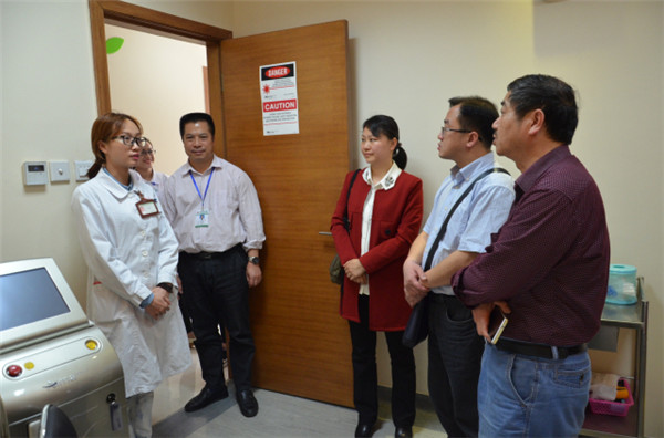 黄仲海对桂林市中西医结合医院一行人的到访表示热烈欢迎,并从一附院概况、美肤激光整形科、中医“治未病”中心的情况等方面进行了简要的介绍。随后,客人一行在黄仲海的陪同下到美肤激光整形科、中医“治未病”中心实地参观学习。客人此行就该院即将开设的“治未病”中心业务开展进行学习,客人从科室的基建装修、功能区域划分、仪器设备购置以及人才引进培养、基础业务开展等工作与一附院进行了深入交谈。