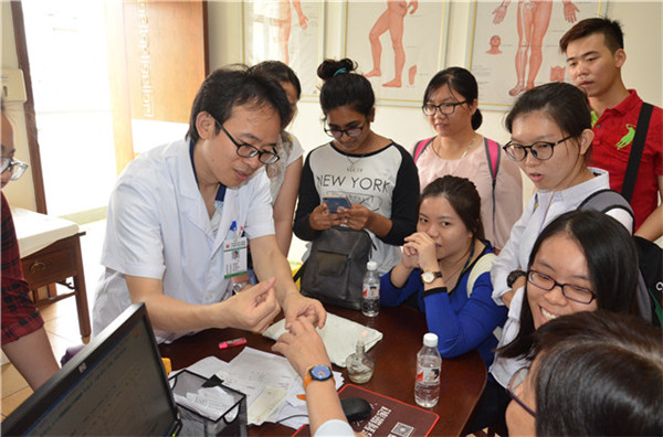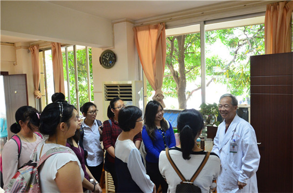 马来西亚拉曼大学代表团到一附院参观访问 来源:一附院 作者:徐昊 日期:2017-05-26 点击数: 次 分享到: 5月25日上午,马来西亚拉曼大学一行9人在星空彩票老版本下载国际教育学院老师的陪同下到一附院进行参观访问。 参观团一行人参观了一附院院史馆、中医药文化长廊,并访问了中药房、煎药室、针灸科、推拿科、壮医科、脾胃病科等中医特色科室。 此次参观,一附院浓郁的中医药文化氛围给参观团成员留下了深刻的影响,代表团一行表示虽时间短暂,但是了解到了很多中医中药知识,不虚此行。 代表团参观黄鼎坚名医工作室 体验药线点灸疗法 代表团合影 打印正文 关闭本页