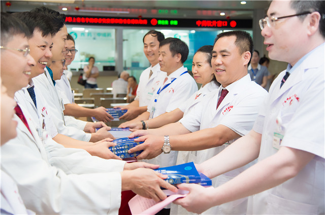 随后,为弘扬中医文化精神,传承中医经典,医院为每位在职医师赠送了一本《中医经典必读释义》,医院领导班子亲自为在场的医师代表赠书。同时,院领导还为医师们送上节日蛋糕,共同欢度医师节,并与大家亲切握手,热烈交谈。