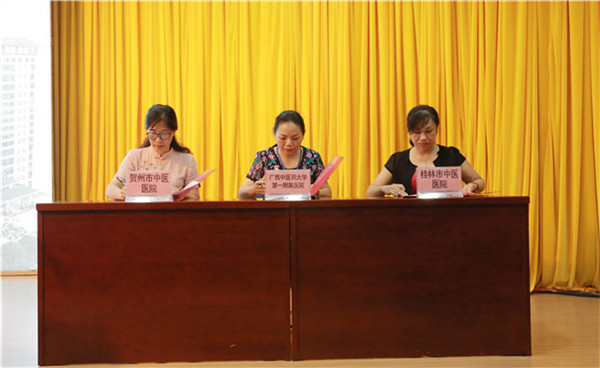 会上,与会领导分别向广西国际壮医医院、南宁市中医院、柳州市中医院、桂林市中医医院等20家“广西中医护理专科联盟推进会”副理事长单位进行了授匾,为140家理事单位颁发了证书。一附院护理部韦衡秋主任与联盟单位代表进行了签约仪式。