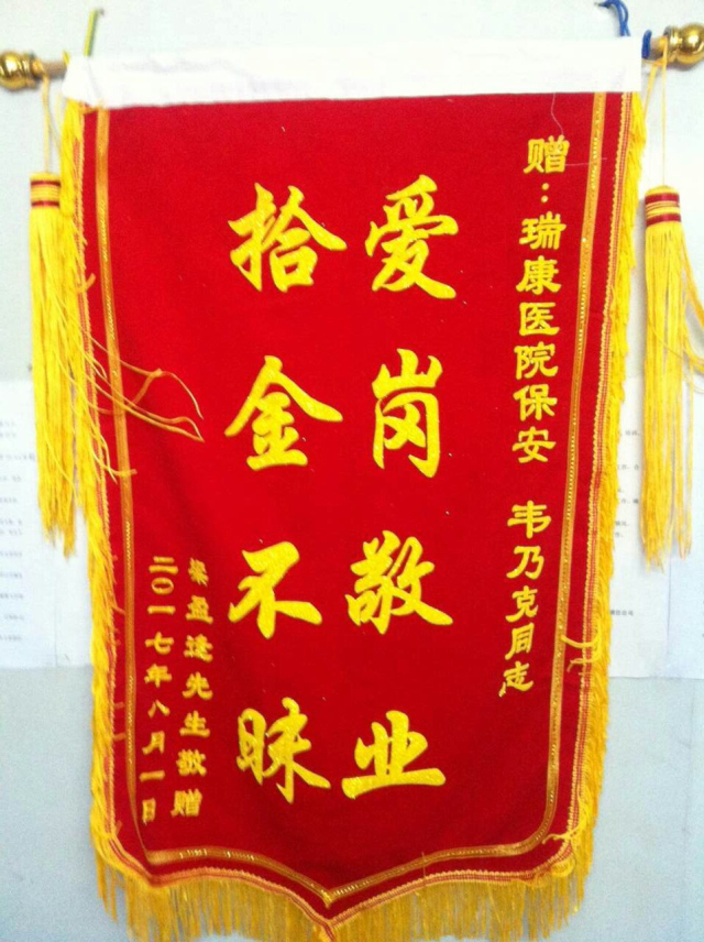 8月2日下午,失主给当事保安人员送来了锦旗,表扬医院保安人员拾金不昧的优良品德。