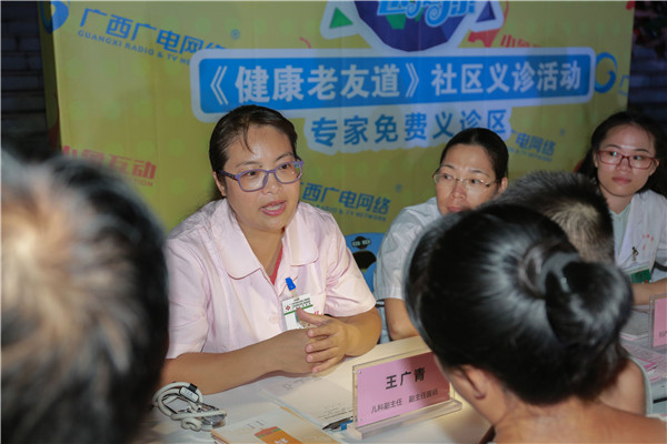 为倡导健康的生活方式,促进社区居民健康水平提升,一附院与广西影视频道《健康老友道》栏目组携手,共同策划了为期三个月的“进社区 送健康”大型社区义诊系列公益活动。9月9日晚,一附院仙葫院区教授博士团如约来到阳光新城社区广场开展“进社区 送健康”活动,此次义诊专家来自骨科、康复医学科、妇产科、儿科、脾胃肝病科、壮医科等科室。