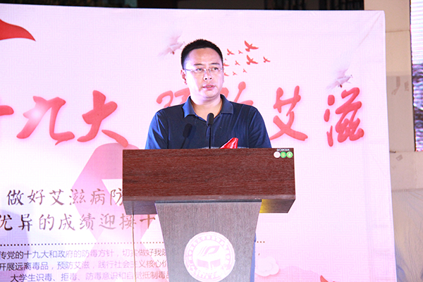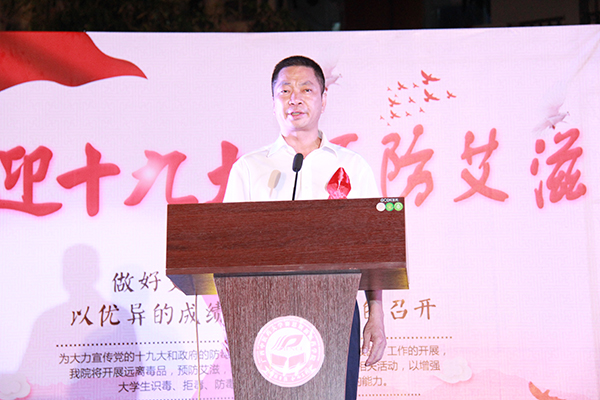 马杰津讲话。马书记首先肯定了我院以文艺晚会迎接党的十九大胜利召开是一种新的形式,并表示通过此次晚会发出正能量,将会对艾滋病防治的宣传起到积极作用。他鼓励大学生要建立文明健康的生活方式,积极参加防治与抗争毒品与艾滋病的公益事业中,为“禁毒防艾”工作奉献自己的力量。同时“双节”将至,他对同学们致以节日的祝福,也提醒同学们在节假期间更要紧绷安全之弦,提高自身安全防范意识。