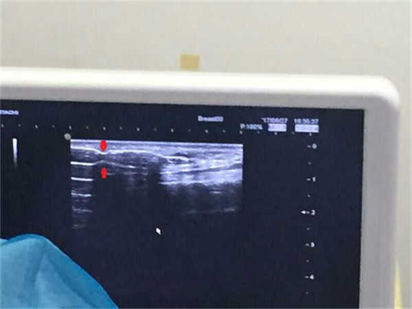 治疗前B超下内瘘血管可见明显狭窄(双凹切迹,红色箭头处)