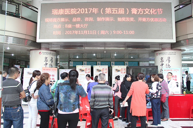2017年11月11日上午,瑞康医院第五届膏方文化节现场体验活动在医院B座1楼大厅开展,活动现场有膏方展示、品尝、咨询、制作演示、抽奖发奖等丰富多彩的活动,旨在向邕城市民推广膏方养生治疗理念,普及膏方文化知识。