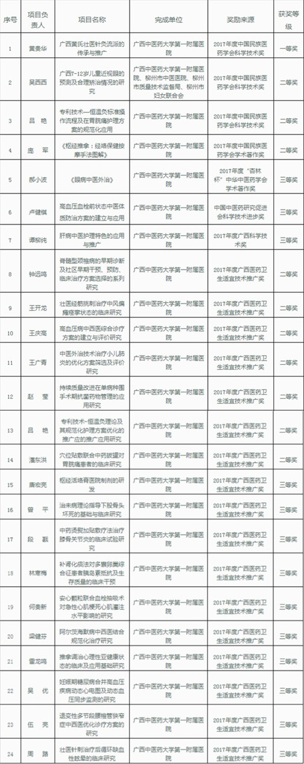 为推进一附院“研究型医院”建设,提升科技创新能力水平,促进科研成果转化,2017年,一附院强化现有科研成果整合、提炼,积极组织各项目组申报各级别科技成果奖励共47项。近日,各级主管部门捷报频频传来,截止11月21日止,一附院获得中国民族医药学会科学技术奖一等奖1项,二等奖2项;中国民族医药学会学术著作奖二等奖1项;广西科技进步奖三等奖1项;中华医药学会学术著作奖三等奖1项;中国中医药研究促进会科学技术进步奖三等奖1项;广西医药卫生适宜技术推广奖二等奖7项,三等奖10项,共计24项奖励,奖励等级与数量再创新高。