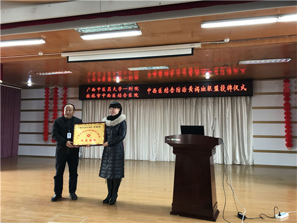 12月6日一附院美肤科主任冯纬纭及梁桂枝医生、文清医生等四人来到桂林市中西医结合医院,在该院举行了隆重的授牌仪式。桂林市中西医结合医院院长蔡葵、副院长陈明及该院的相关职能科室负责人及医护人员出席了授牌仪式。冯纬纭主任在会上表示我们将秉着“共建共享、创新创业”的理念,把中西医结合防治黄褐斑的成熟技术及其他的优质医疗资源以学术讲座、技术合作、人才培养、制剂研发等形式与桂林市中西医结合医院共享,以惠及更多的百姓,为我区医药卫生体系改革的健康快速发展尽力。