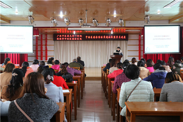 授牌仪式结束后,一附院美肤科的医生围绕黄褐斑的防与治作了精彩的学术讲座,分别讲授了《壮医莲花针拔罐逐瘀法治疗损美性疾病的运用体会》、《中西医结合防治黄褐斑》,把黄褐斑最前沿的研究进展、临床经验及适宜技术等作了深入浅出的生动阐述,使参会的医务人员受益匪浅。