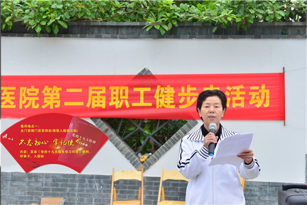 周广林在讲话中指出,健步走是国家体育总局从2005年以来一直推广的、不受场地限制、简单易行、老少皆宜的一种健身方式。通过倡导行走运动从而推广体育健身理念、养成积极健康、文明环保的生活方式,更好的宣传“绿色运动理念”。此次活动是我院工会贯彻落实党的十九大精神和上级工会有关文件精神的具体体现,是弘扬中医文化,全力构建和谐健康医院的又一重要举措,对在全院营造全员保安康、和谐促发展的良好文化氛围,推动全员健身意识不断深入开展具有积极而深远的意义,她同时预祝本次健步走活动取得圆满成功。