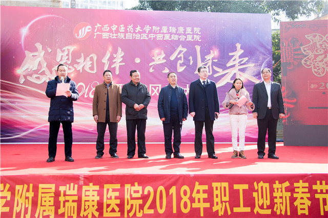 为深入学习宣传贯彻党的十九大精神,倡导和弘扬社会主义核心价值观,增强职工的凝聚力和向心力,全面展示新时期职工文化建设成果和职工健康向上的精神风貌,2月3日上午,瑞康医院在华强小学举行2018年职工迎新春趣味游园活动。早上十点,操场上便陆陆续续地开始聚起人群,医院院长唐友明,党委书记高宏君,党委副书记、副院长陈日兰,副院长庞刚、韦思尊,党委副书记、纪委书记黄建民,副院长陈锋,广西中西医研究所所长龙学明到场参加。