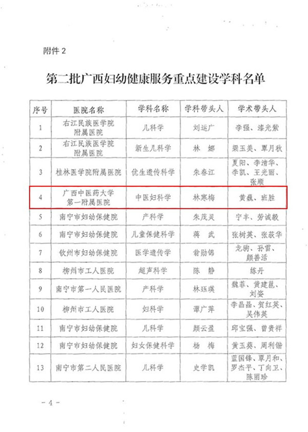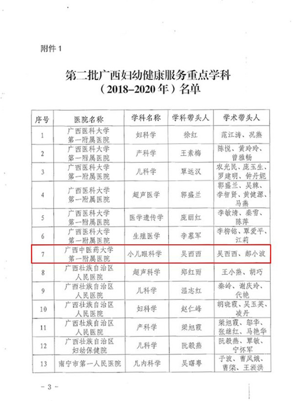 近日,广西壮族自治区卫生和计划生育委员会发布了《自治区卫生计生委关于确定第二批广西妇幼服务重点学科(建设)学科的通知》,一附院“小儿眼科学”、“中医妇科学”分别获评为第二批广西妇幼服务重点学科和重点建设学科。
