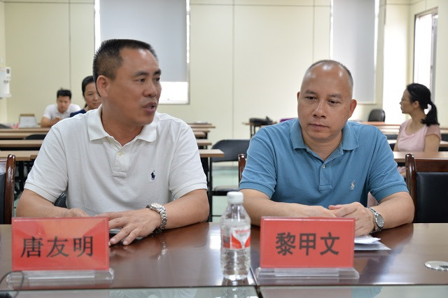 唐友明院长(左一)与黎甲文处长会上交流