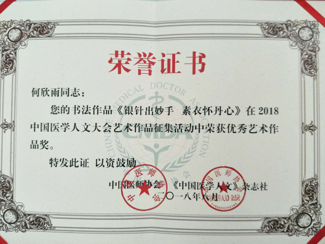 8月31日上午,由中国医师协会、中国医师协会人文医学专委会、白求恩精神研究会及《中国医学人文》杂志共同主办的第二届中国医学人文大会在北京国际会议中心举行。瑞康医院ICU护士何欣雨书法作品“银针出妙手 素衣怀丹心”荣获大会优秀艺术作品奖。