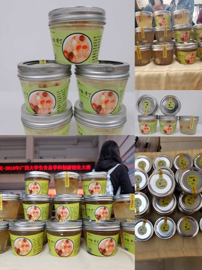 赛院在2018年广西大学生食品学科创新创业大赛中喜获佳绩 来源:赛恩斯新医药学院 作者:赛恩斯新医药学院 日期:2018-11-26 点击数: 次 分享到: 由广西壮族自治区教育厅主办,广西大学承办的2018年广西大学生食品学科创新创业大赛于11月24日至25日在广西大学轻工与食品工程学院举办,共有来自全区六个高校食品类专业学生的58个产品参赛。赛院食品质量与安全专业学生魏淑利、蒋颖等制作的“四物.布丁”获得一等奖;郭浩、梁平等制作的“莲心枣”获得三等奖;邱伟、杨金元等制作的“麻辣杏鲍菇”荣获最受欢迎奖。 参赛产品 打印正文 关闭本页