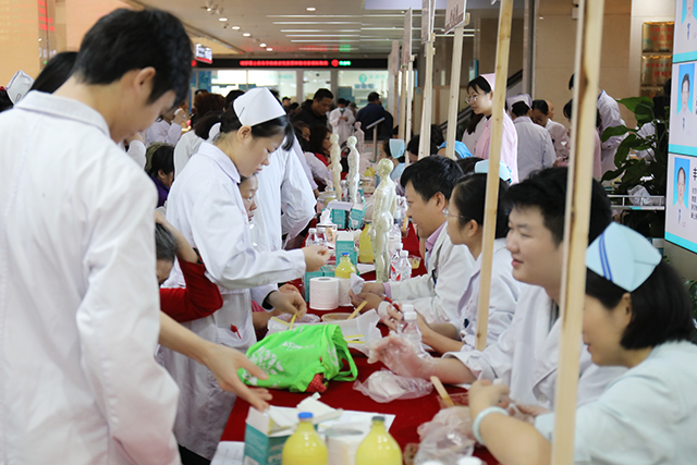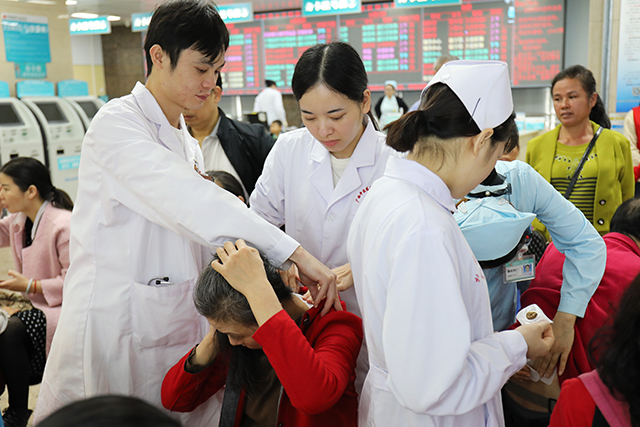 随着唐友明宣布活动开始,各科室医务人员或站着、或坐着、或蹲着,针对群众的需求对不同穴位进行贴敷,并耐心地解答他们的疑惑,对相关疾病提出了日常预防、保健及治疗建议。