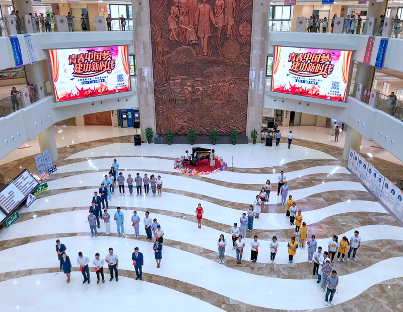 4月30日早上,广西国际壮医医院门诊大厅和往常一样,人来人往,患者们正在挂号、取药、就医。忽然,一位青年慢慢走向大厅中央的钢琴,奏响乐曲,另一侧,一位女生拿出小提琴加入演奏……更多的国壮青年从四周走来,渐渐聚拢,围绕在乐手周围时而舞动身姿,时而变换队形,一同吟唱《长城谣》、《光荣啊!中国共青团》、《我和我的祖国》、《我和2035有个约》,中间还穿插了配乐诗朗诵《青春中国》、歌伴舞《年轻的朋友来相会》……他们头顶传递国旗与团旗,手中挥舞着小国旗,举着青春励志牌,群情激昂,展现着新时代新青年的蓬勃风采,深情表达对祖国的热爱与祝福。