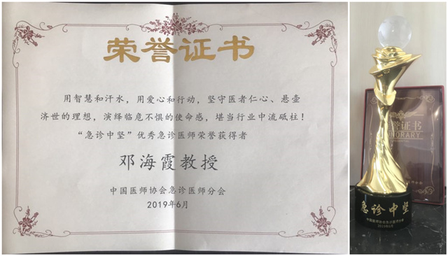 6月15日,由中国医师协会、中国医师协会急诊医师分会和全军急救医学专业委员会联合主办的“2019年第十届中国医师协会急诊医师年会”在四川省成都市召开。在开幕式进行的优秀急诊医师颁奖仪式上,一附院仙葫院区急诊科主任邓海霞医师荣获“急诊中坚”优秀急诊医师称号。