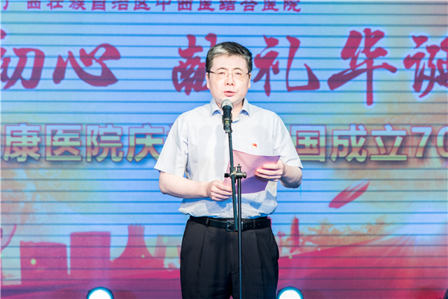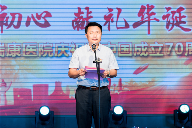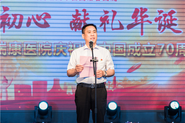 庞宇舟在致辞中对祖国70周年华诞表示衷心的祝福,并代表学校党政领导向为祖国的医疗卫生事业发展而努力工作的医院全体员工、离退休干部致以诚挚的问候。他表示,2019年附属瑞康医院不断开拓进取,各项工作有力推进,取得了不少喜人的成绩。希望在今后的工作中,医院广大干部职工要“不忘初心、牢记使命”,不断增强“四个意识”、坚定“四个自信”,做到“两个维护”,以更加饱满的工作热情投入到工作中,脚踏实地,忠实履行岗位职责,为实现中华民族伟大复兴的“中国梦”贡献力量。