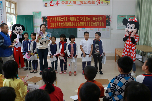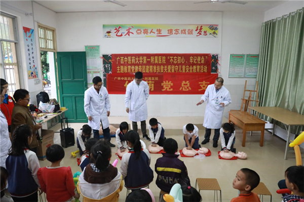 为了深入贯彻落实习近平总书记重要指示精神,根据学校党委及一附院党委有关要求,把“不忘初心、牢记使命”主题教育引向深入,将主题教育工作与脱贫攻坚相结合,10月24日上午,一附院仙葫院区党总支携手一附院团委组织医务党员、青年志愿者们一同前往隆安县南圩镇四联村,开展“不忘初心、牢记使命”主题教育党建带团建“精准扶贫关爱留守儿童安全教育”及健康扶贫送医上门活动。