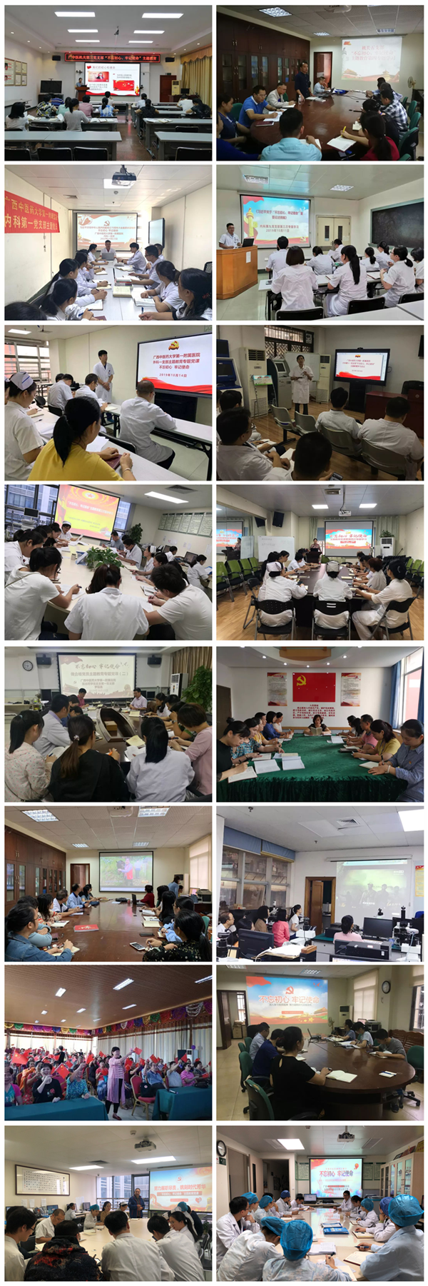 一附院党委启动“不忘初心、牢记使命”主题教育以来,一附院各党支部利用“主题党日”、支部书记上党课、观看爱国影片等形式对主题教育进行了动员和学习。支部书记带领大家提高政治站位,明确主题教育的重大意义、总体要求和任务目标,并做好支部主题教育学习计划,明确学习内容、学习方式、时间节点。在对主题教育进行部署之后,各党支部书记带领支部党员集中学习《习近平新时代中国特色社会主义思想学习纲要》《习近平关于“不忘初心、牢记使命”论述摘编》内容,同时开展黄文秀、唐庆祝等先进人物事迹专题学习,集中观看爱国影片、革命影片。每次组织学习后,各支部支委和党员代表还围绕学习主题,进行讨论和发言,引发了党员们的强烈共鸣。