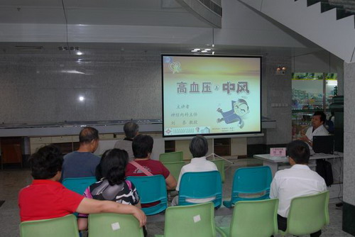 2009年10月8日是我国的第十二个“全国高血压日”, 根据今年“全国高血压日”的主题,为了提高民众对高血压疾病的认识,呼吁居民改善生活方式,减少食盐摄入,有效地预防和控制高血压, 2009年10月10日,一附院于新门诊楼大堂内开展了“盐与高血压”主题义诊活动,广西名中医李忠业、钱海凌等心血管病专家以及神经内科、干部病区、预防保健科、营养膳食科的多位教授为前来诊病的近100位群众义诊及提供咨询服务,神经内科主任刘泰教授应用多媒体这一通俗易懂而又生动的形式为大家进行了“高血压与中风”的健康宣教,是一附院“周末健康大放送”讲堂系列活动的首次讲座,受到参加活动病友及群众的好评和热烈欢迎。