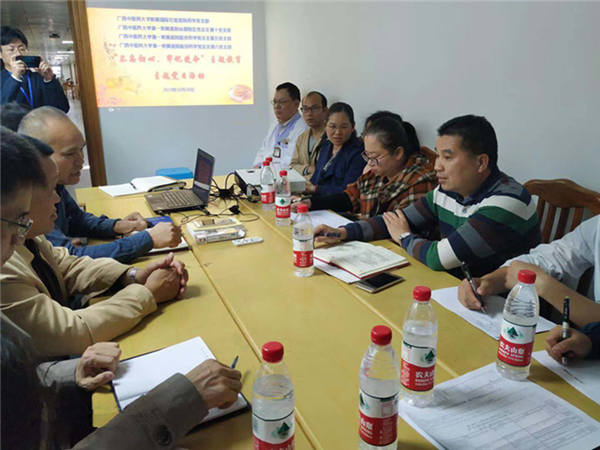 为深入开展“不忘初心、牢记使命”主题教育工作,促进党建与业务融合,创新开展“三会一课”。日前,一附院仙葫院区党总支第十党支部、医技药学党总支第五、第六党支部与广西国际壮医医院药学部党支部联合开展主题党日活动。非党员中层干部、一附院药学部主任黄敏同志参加活动,并作业务交流发言,他对党建促进药学业务给予高度肯定。