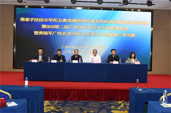 11月15日-17日,由星空彩票老版本下载第一附属医院主办的“推拿手法结合华佗五禽戏调治脊柱相关性疾病的临床应用学习班暨2019第二届广西中医导引学专科联盟年会暨黄锦军广西名老中医工作室学术经验推广学习班”在广西南宁市召开。会议来自区内各医院共200多名针灸、推拿、康复、治未病中心等临床学科及相关领域的医务人员及广西中医导引学专科联盟单位成员参会。