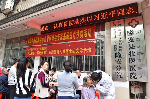 为助力脱贫攻坚工作,切实提高我国中医心血管病基层医师诊疗技术和学术水平,缓解基层特别是贫困地区群众看病难问题,11月24日,由中华中医药学会心血管病分会及一附院派出专家博士到隆安县中医医院及南圩镇联伍村开展“中华中医药学会心血管病分会专家基层医疗扶贫(广西隆安站)暨星空彩票老版本下载第一附属医院‘不忘初心、牢记使命’主题教育专家博士团义诊活动”。