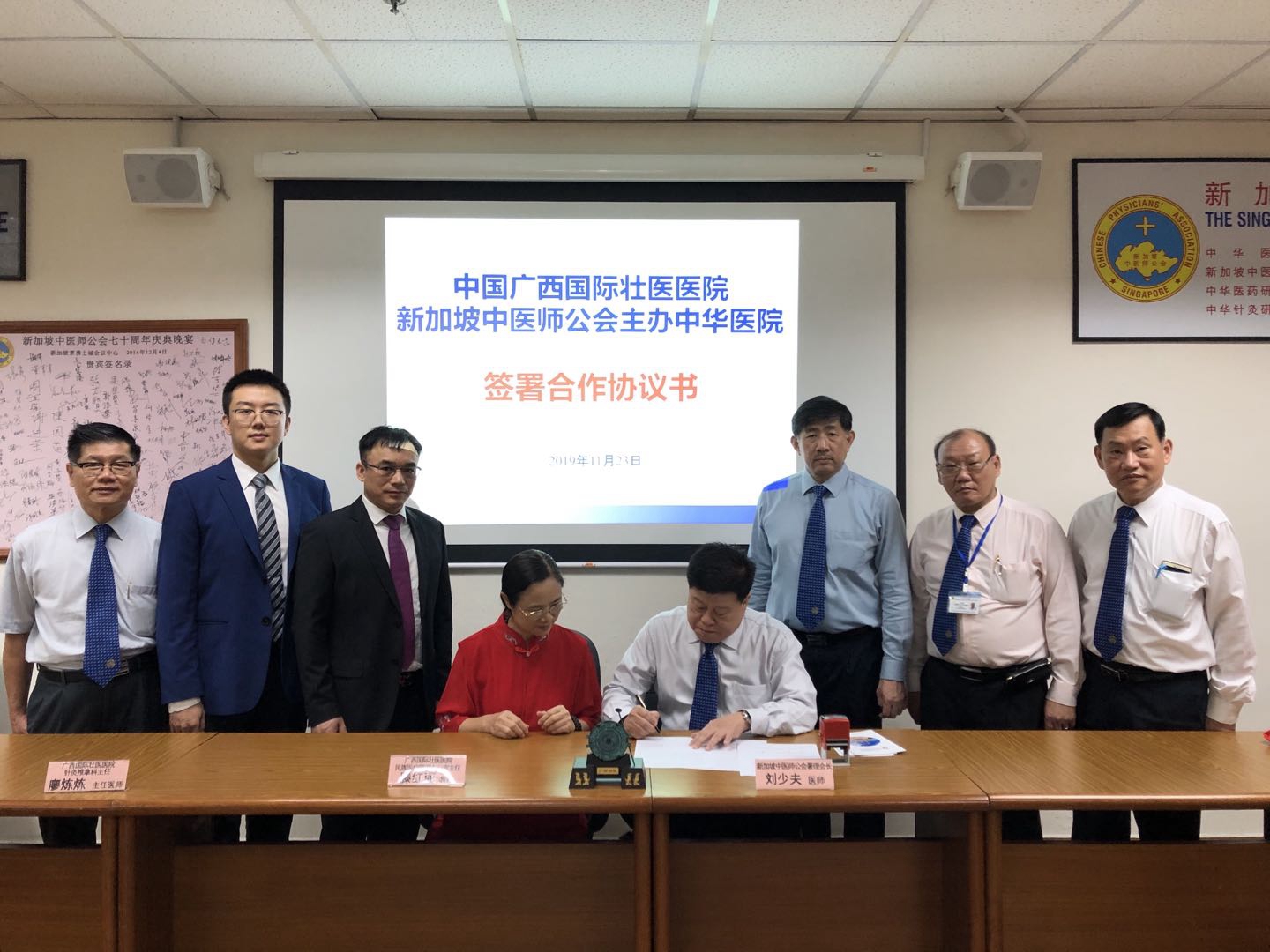 11月23日,我校附属国际壮医医院(以下简称“国壮”)“中国-新加坡民族医特色诊疗技术培训与示范应用国际合作基地”,在新加坡中医师公会主办中华医院正式挂牌。国壮还与新加坡中医师公会主办中华医院签订合作协议,下一步将互派专家坐班出诊、进修学习、开展优势病种培训交流等。这将是国壮向柬埔寨宏恩医院派出中壮医专家后,向东盟第二个国家派出中医民族医专家,将进一步推动中医民族医在“一带一路”沿线国家的应用和传播。