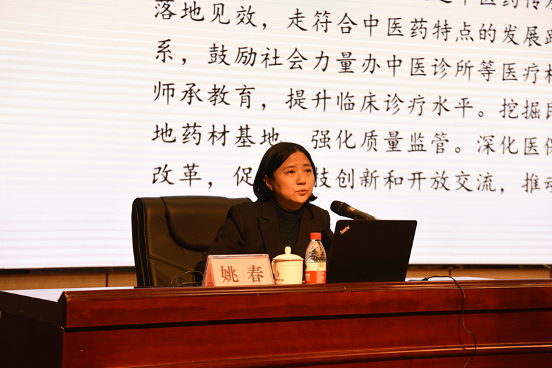 会上,姚春首先传达学习了在全国中医药大会上习近平总书记的重要指示、李克强总理的批示和孙春兰副总理的讲话。并结合参加全国中医药大会的亲身体会,深刻分析了当前广西中医药壮瑶医药的基本形势和存在问题,围绕学习贯彻《关于促进中医药传承创新发展的意见》精神,对进一步促进中医药壮瑶医药传承创新发展作出了深入浅出、全面系统的阐述。她表示,要大力弘扬中医药壮瑶医药文化,完善中医药壮瑶医药管理体制机制及政策措施,制定发布广西道地药材目录,重点推进一批广西中药材示范基地建设,加强中医药壮瑶医药人才队伍建设,促进中医药壮瑶医药传承与创新发展。