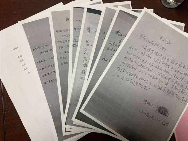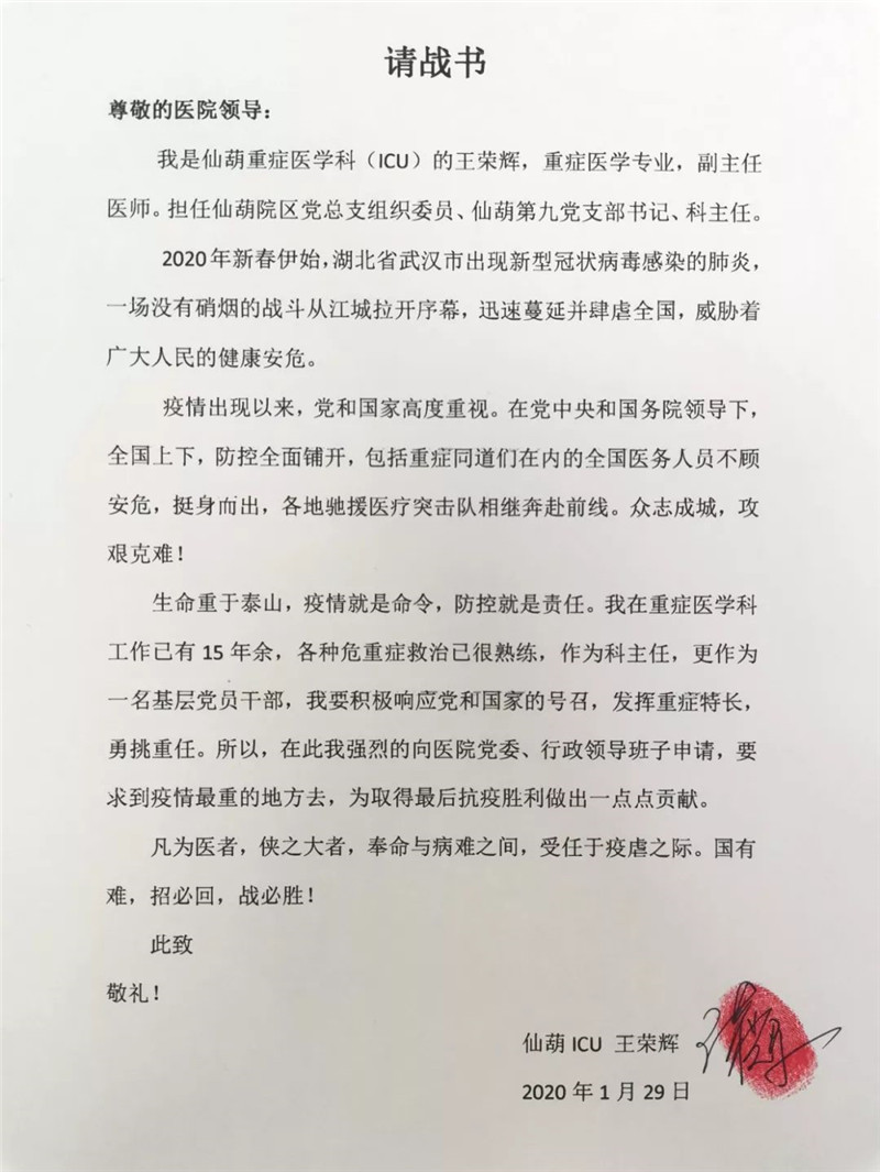 在仙葫重症医学科,6名医生及21名护士写下了请战书。科主任王荣辉在请战书中写到:“我在重症医学科工作已有15年余,各种危重症救治已很熟练,作为科主任,更作为一名基层党员干部,我要积极响应党和国家的号召,发挥重症特长,勇挑重任。所以,在此我强烈的向医院党委、行政领导班子申请,要求到疫情最重的地方去,为取得最后抗疫胜利做出一点点贡献。”