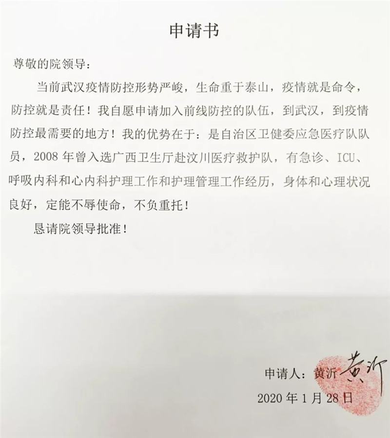 一附院发出驰援武汉的号召后,得到了护士们的积极响应。有14个科室的护理人员(除休产假人员外)全员请战;有的护士提前结束休假,在回程的车上写下战书……作为一附院护理部主任,黄沂在看到护士们的请战书时内心充满了感动。她在自己的请战中这样写到:“当前武汉疫情防控形势严峻,生命重于泰山,疫情就是命令,防控就是责任!我自愿申请加入前线防控的队伍,到武汉,到疫情防控最需要的地方!我的优势在于:是自治区卫健委应急医疗队队员,2008年曾入选广西赴汶川医疗救护队(待命出发),有急诊、ICU、呼吸内科和心内科护理工作和护理管理工作经历,身体和心理状况良好,定能不辱使命,不负重托!”