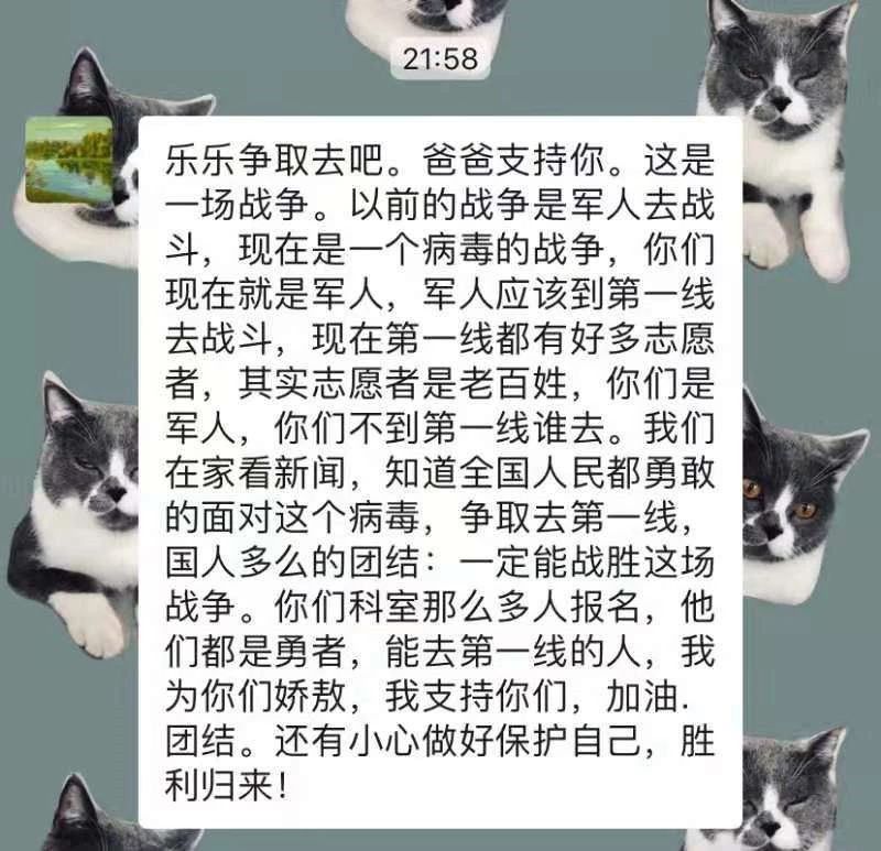 韦乐是仙葫院区重症医学科的一名护士,当她的爸爸得知她请战支援武汉后,在微信上发来这一段话:“乐乐争取去吧。爸爸支持你。这是一场战争。以前的战争是军人去战斗,现在是一个病毒的战争,你们现在就是军人,军人应该到第一线去战斗,现在第一线都有好多志愿者,其实志愿者是老百姓,你们是军人,你们不到第一线谁去……你们科室那么多人报名,他们都是勇者,能去第一线的人,我为你们娇敖(骄傲),我支持你们,加油,团结。还有小心做好保护自己,胜利归来!”