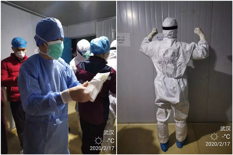 军令如山,面对突如其来的紧急任务,一附院医疗队队员主动请缨,出征首战。最终,临床经验丰富的欧阳暾和曾在发热门诊支援的农彩芬成为正式进入沌口方舱医院的第一批广西医疗队队员。得知两位队员即将入舱,其他队员们及远在后方的同事们纷纷给他们加油打气,并一再叮嘱:“注意做好防护”。