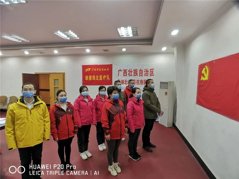 “我志愿加入中国共产党,拥护党的纲领,遵守党的章程,履行党员义务......”3月6日晚上,一附院第一批驰援湖北医疗队的郑春秋经自治区卫生健康委直属机关党委批准,在湖北十堰市竹溪县医疗队驻地,面向鲜红党旗,高举右拳,用沉稳而激动的声调庄严宣誓,光荣地成为了一名中国共产党预备党员。一附院赴湖北医疗队临时党支部书记陈平也带领全体党员重温入党誓词。