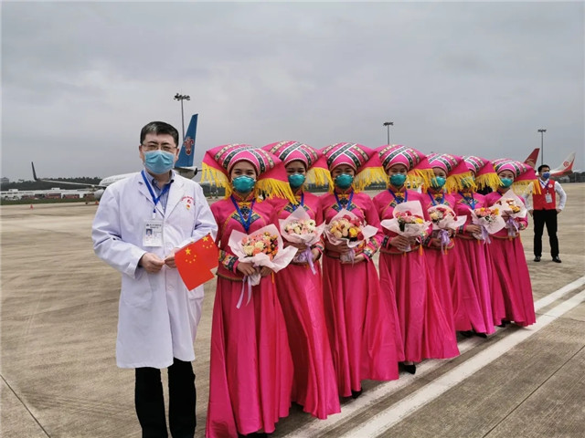短暂的迎接仪式后,广西医疗队员将前往酒店进行休整和安全隔离。