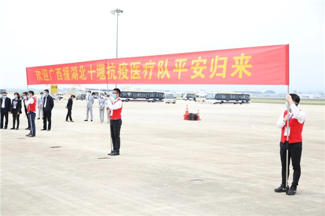 中午12时24分,在大家的期待中,搭载着广西第三批对口支援十堰医疗队的“胜利号”航班顺利落地!