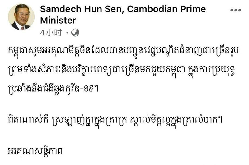 4月6日下午,柬埔寨首相洪森特别在其官方脸书(Facebook)发贴,“感谢中国朋友派遣医疗专家组和援助抗疫医疗物资,协助柬埔寨抗击新冠肺炎疫情”。并称赞中柬友谊是“患难见真情“的铁杆好朋友。