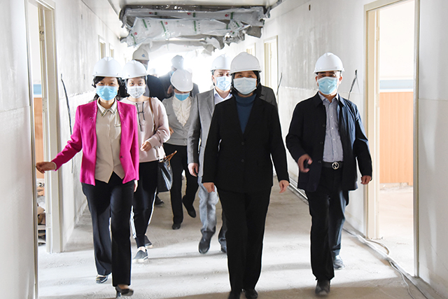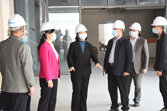 在紧张施工的住院综合大楼内,姚春先后考察了样板病房、护士站、康复中心、高压氧舱、会议大厅等地,唐友明详细汇报了院区工程项目规划、建设进度及发展思路。
