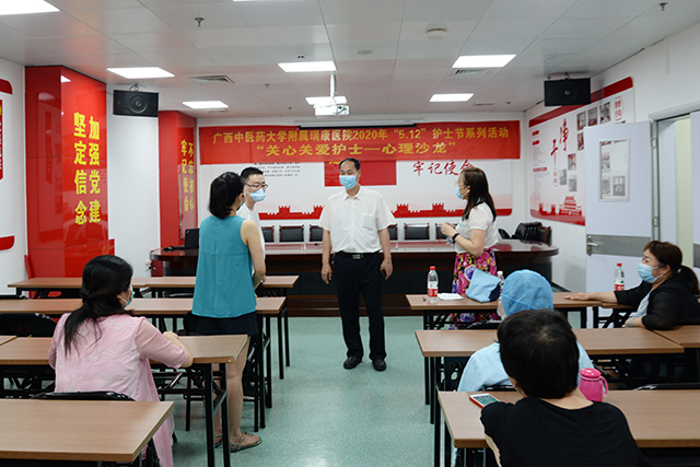 在“5.12”国际护士节即将来临之际,5月7日下午,由附属瑞康医院护理部和社工部联合举办“关心关爱护士—心理沙龙”的活动在第二会议室举行,副院长陈锋出席活动。广西区妇联心理健康专家组成员、国家二级心理咨询师倪亮老师受邀开展心理讲座、提供心理疏导。部分驰援湖北抗击新冠肺炎归来的一线抗疫护士及医院各临床科室的护理人员等共30余人参加活动,活动由护理部主任龙秀红主持。