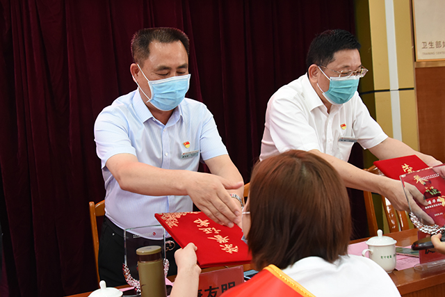 会上,陈日兰宣读《关于给予唐晓等22名援鄂医疗队队员表彰及记功的决定》,院领导为全体医疗队员颁发纪念牌和荣誉证书。