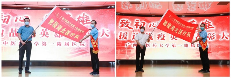 陈平、欧阳暾两位战疫队长分别向一附院党委书记桂雄斌、院长谢胜归还队旗。