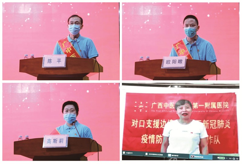 队员代表陈平、欧阳暾、高斯莉依次上台发言,讲述抗疫期间的工作经历与所见所闻,分享他们战疫的感悟与收获,表达了对党和政府、学校和医院、共同奋战的“战友”、全力支持的广中医人与家人的感谢。队员赵莹也通过视频的方式进行了分享,因其仍在支援边境抗击疫情工作,未能亲至现场。