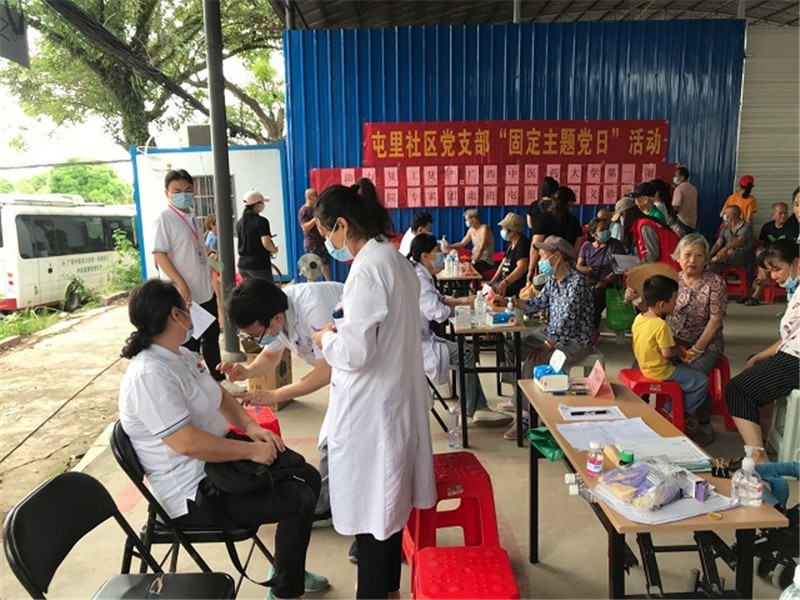 为助力复工复产复课,推动全民健康管理工作,6月3日,由一附院外联拓展部组织一附院仙葫院区骨二科、壮医针灸科、脑病科3个科室共5名医护专家,携手屯里社区党支部成员和部分党员深入开展“不忘初心、牢记使命”主题党员活动日的工作安排,为屯里社区居民开展送医、送健康惠民义诊活动。