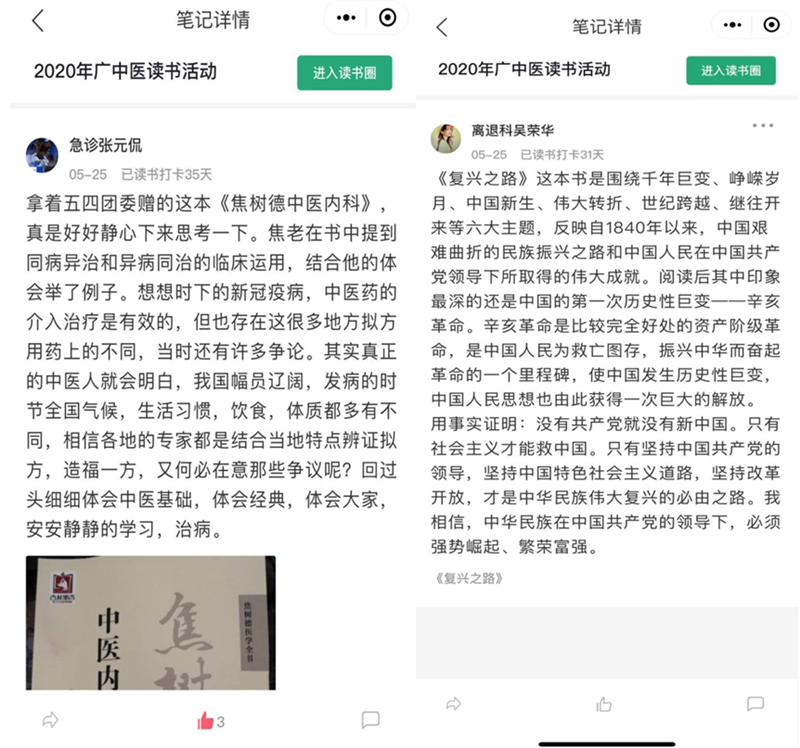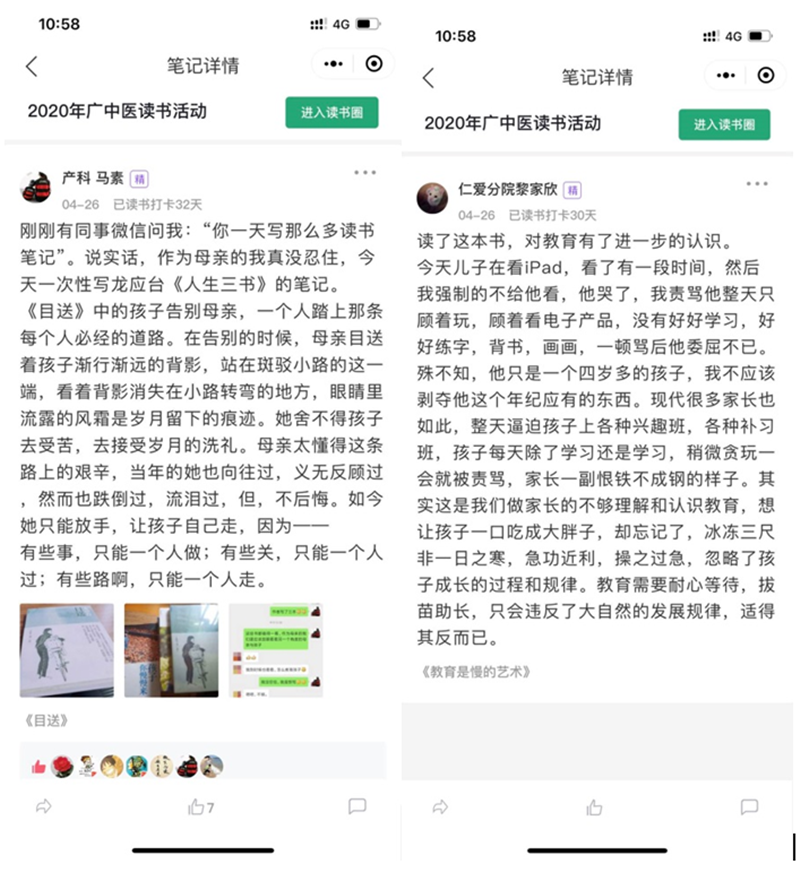 读书活动为适应国家新冠肺炎疫情防控的要求,采用微信“全民读书打卡”小程序作为活动数据采集平台,借助线上活动程序有效减少聚集,丰富职工阅读生活。经过数据统计参与活动人数共912人,参与阅读打卡人数为384人,广大职工通过线上打卡形式,慷慨分享各自的读书笔记,并将所读所学所悟融入笔记之中,拓宽了视野,提升了学习热情和学习动力,激发了探索知识海洋的能动力,为进一步促进学习型医院营造了良好的氛围。