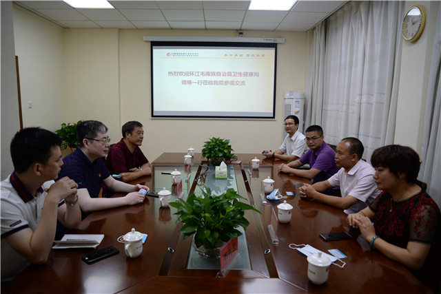 7月7日,环江毛南族自治县卫生健康局局长谭正良一行到附属瑞康医院考察交流,受到医院党委书记高宏君、副院长韦思尊以及相关职能科室负责人的热情接待。