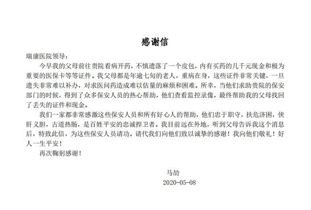 近日,年逾七旬的郭阿姨,将儿子马劼特意从海外发回来的感谢信转发给附属瑞康医院医院院长。“作为子女,多年来旅居海外,年迈的父母是我最大的牵挂。我父母都是年逾七旬的老人,重病在身,遗失的这些证件非常关键,一旦遗失非常难以补办,对求医问药造成难以估量的麻烦和困难。所幸,当他们求助贵院的保安部门的时候,得到了众多保安人员的热心帮助,他们查看监控录像,最终帮助我的父母找回了丢失的证件和现金。我目前远在外地,听到父母告诉我这个消息后,特致此信。好人一生平安!再次鞠躬感谢!”